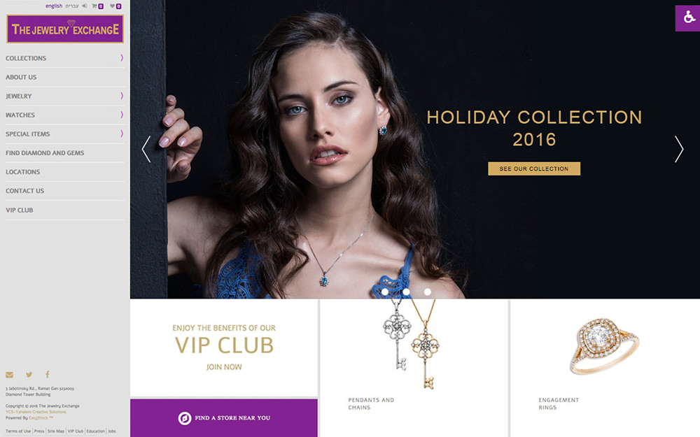 אתרי מסחר אלקטרוני מבוססי EasyStock פותחו במיוחד עבור תעשיית היהלומים והתכשיטים, עם תכונות כמו  מנוע מהיר ומדויק במיוחד לחיפוש יהלומים, מודול "עצב לעצמך טבעת"‫, תמחור דינמי ותכונות נוספות. הפתרונות שלנו מסייעים לך בבנייה ותפעול שוטף של אתר המסחר האלקטרוני, ומאפשרים לך להתמקד בתחומי הליבה של העסק.